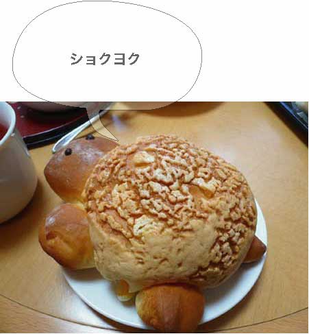 7日目.この期間にいろいろと食べ物の好みが変化しました.パンがやたらとおいしいのです.ともだちからの差し入れの「かめ」.どこから食べるか悩みつつ,いただきます. UZULAB-sh.