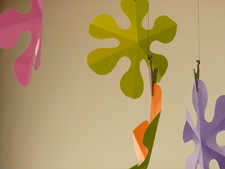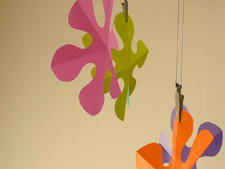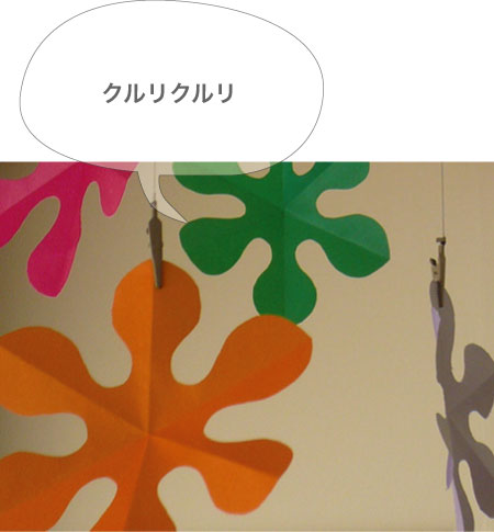 写真1,2,3,4,5:手作りモビールの様子.両面折り紙とカッター、クリップではさむタイプのモビールでつくられています.