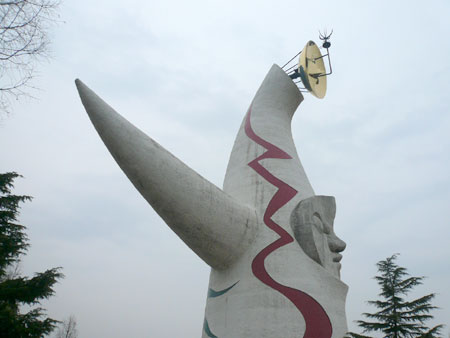 太陽の塔を脇からみる. 天気が悪く, 白さが少し鈍く感じます.
