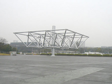 (左)お祭り広場大屋根トラスの一部. 開催時は幅108m , 奥行291.6mという巨大構造物となっていました. (右)前川國男が設計した鉄鋼館の外観. このなかで万博グッズの簡単な展示会がおこなわれていました.