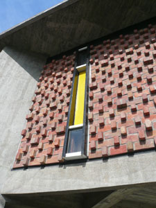 外壁のディテール. 隣り合うレンガが直行するように積み上げられています. くの字型の柱とともに, 外観に独特の表情を与えています.
