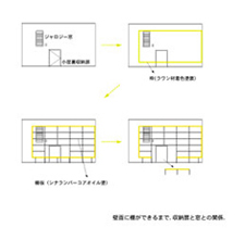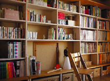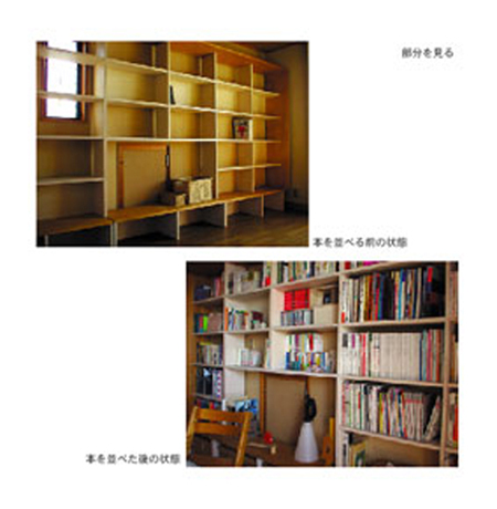 日曜家具1 TANA 2002年に日曜大工でつくった棚です. オフィスの壁面いっぱいを占領しています. 素材は シナのランバーコアを白く染めたものと,ラワン材を濃い色に塗ったものを大枠に使用しています. かなりの量の本を収容することができます.