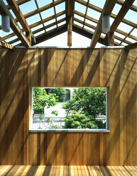 「室内→テラス室→南側の庭→テラス室→室内」といった繋がりがポイントです. テラス室は、減築によって半屋外となり, 外部と内部をつなぐ開放的な緩衝地帯となっています. 気候のいいときはひなたぼっこを楽しめ, 寒いときは太陽光を室内に取り込む役割を果たします.